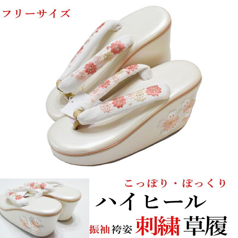草履 成人式 厚底 甲高草履 ハイヒール刺繍 No.009 52 フリーサイズ 白台 白色鼻緒 舞妓さん風 履きやすい 合成皮革 振袖 結婚式 卒業式 着物 和服 痛くない 78454-3