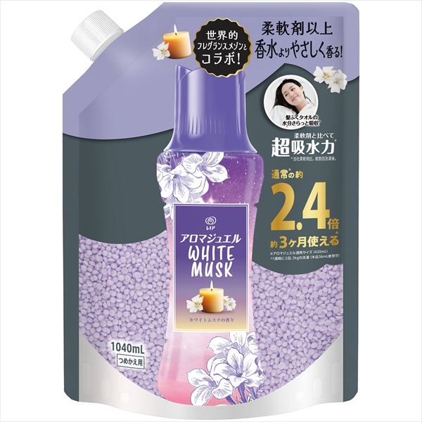 髪ふくタオルの水分さらっと吸収* 柔軟剤と比べて、超吸水*&香り長続き柔軟剤より上質なフレグランスが、香水よりやさしく、長く続きます。上品なルームキャンドルの香り ホワイトムスクの香り:ムスクの上品な甘さと暖かさが優しく重なり、心やすらぐひとときへ。縦型/ドラム式どちらでもOKお洗濯のはじめに入れるだけ!通常※の約2.4倍。 約3ヶ月使える^*当社柔軟剤比。複数回洗濯後。※アロマジュエル通常サイズ(420mL) ^1週間に2回、3kgの洗濯(本品36mL使用で)