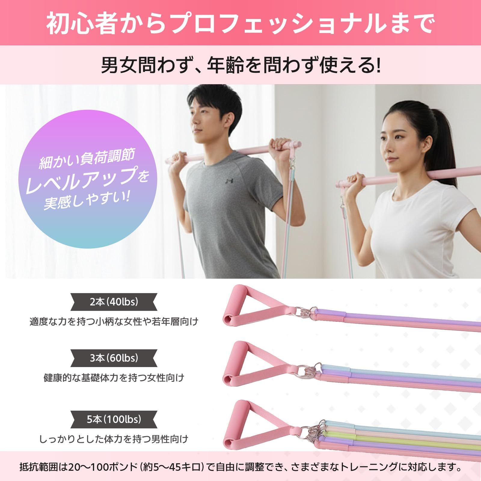 Arkmoon 11点セット トレーニングチューブ・ストレッチバンドは、肩甲骨ほぐしや背筋強化、全身シェイプに最適な多機能セットです。腕・背中・体幹・脚・美尻など、全身の筋肉を効率的にトレーニングできます。 5本のトレーニングチューブは組み合わせて最大約45.4kgまで対応。ハンドル、足首ストラップ、ドアアンカー付きで、自宅や旅行先でも簡単に使用可能。軽量でコンパクト、スペースを節約でき、置き場所に困らない設計。さらに、マカロンカラーの可愛いデザインで、見た目もおしゃれにトレーニングできます。天然ラテックス製で高弾力・防断裂、フォームハンドルは滑り止め仕様で安全に使用可能です。 初心者から上級者まで、自由に負荷を調整可能。日本語説明書&動画付きで正しいフォームを学べます。ヨガ・ピラティス・リハビリ・自宅筋トレなど、さまざまなシーンで活躍する全身トレーニングセットです。