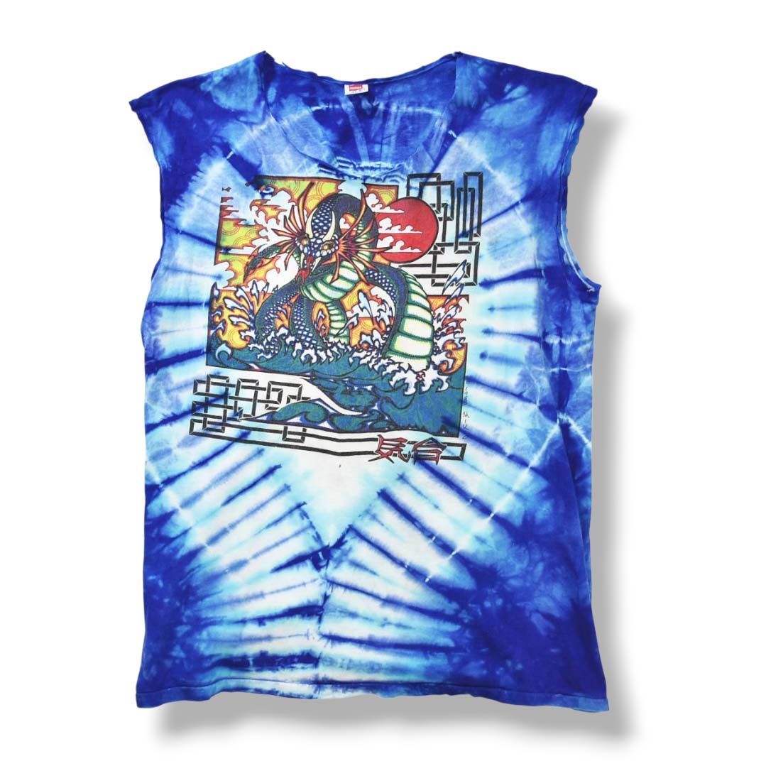 80 sヴィンテージ Mikio kennedy 気合 染み込み ドラゴン タイダイ ノースリーブ Tシャツ カットオフ タンクトップ 半袖 ヘインズ Hanes XL ブルー メンズ