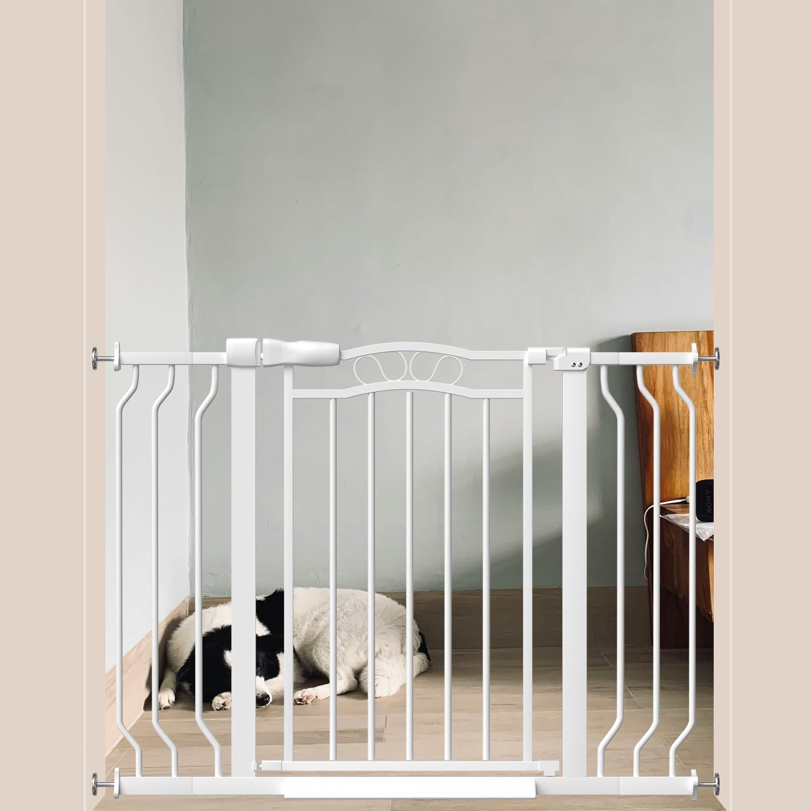 簡単取り付け・突っ張り式で壁に穴不要:ベビーゲートは突っ張り式の設計により、壁に穴を開けることなく取り付け可能です。ベビーゲートは取り外しも簡単で、壁を傷つけません。ベビーゲートは賃貸住宅にも使用できます。ネジを回すだけの簡単設計で、工具不要です。一人でも約15分ほどで取り付け可能です。