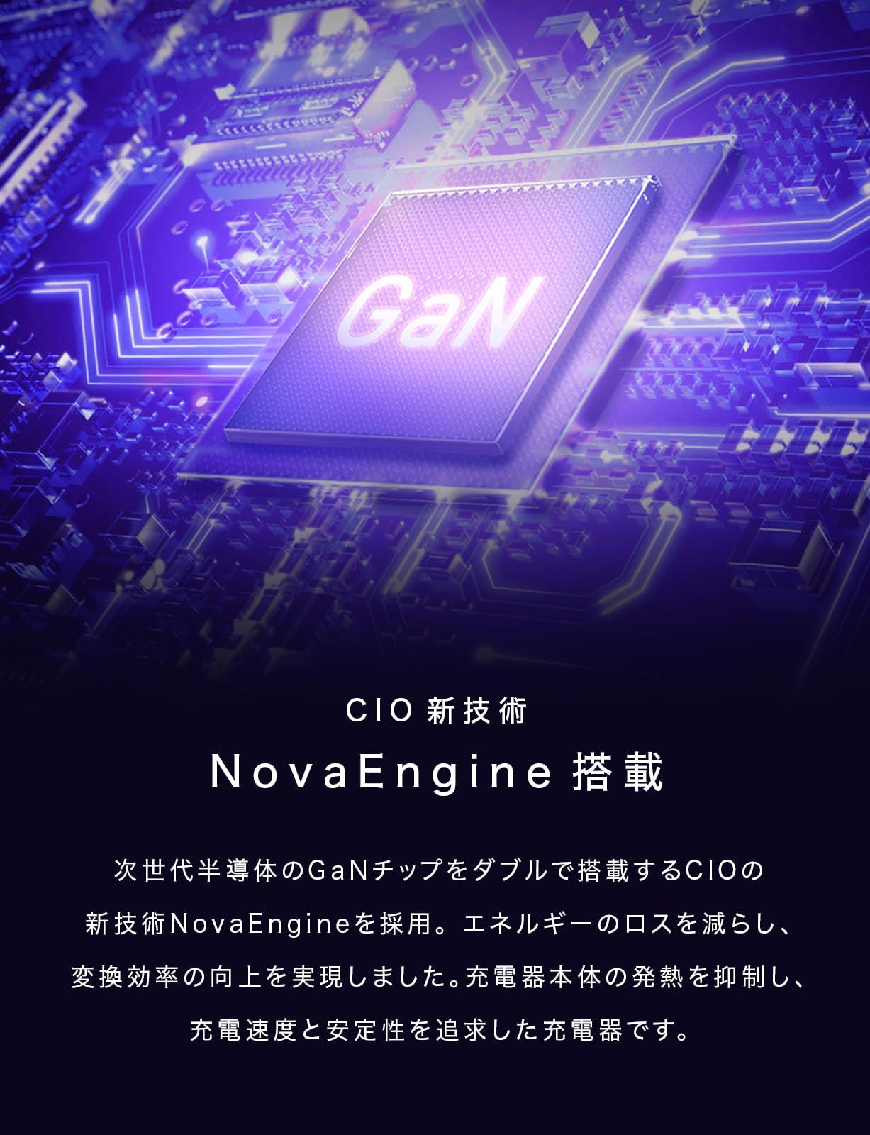 【新技術 NovaEngine搭載】次世代半導体のGaNチップをダブルで搭載するCIOの新技術NovaEngineを採用。エネルギーのロスを減らし、変換効率の向上を実現しました。充電器本体の発熱を抑制し、充電速度と安定性を追求した充電器です。