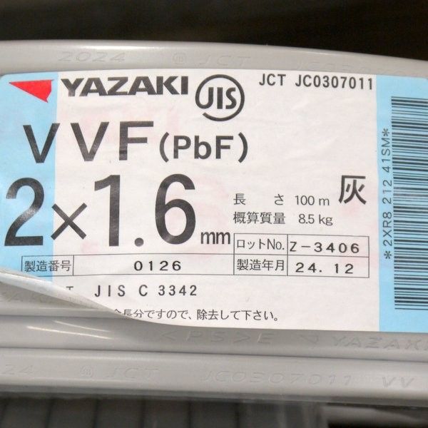 矢崎エナジーシステム YAZAKI VVFケーブル 2×1.6mm 灰色 100m 黒白