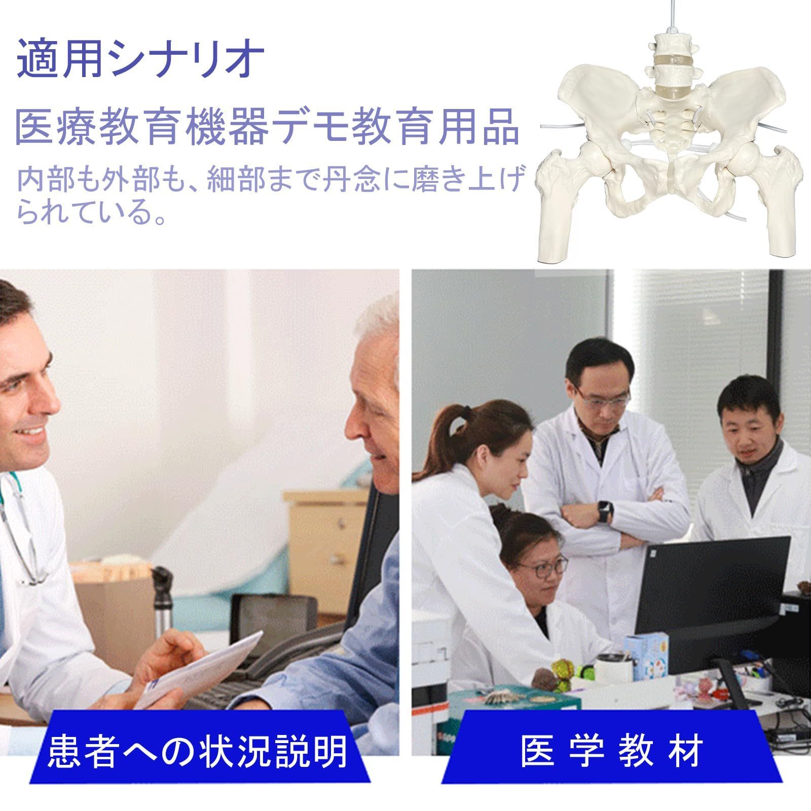 【製品仕様】商品名: 女性骨盤模型(腰椎大腿骨付き)伸縮可能。仙腸関節と恥骨結合、股関節は伸縮コード連結されているので可動できる骨格モデルです。骨材質:ウォッシャブルPVC。サイズ:約幅26cm×奥行19cm×高さ27cm。製品重量: 1.1KG。