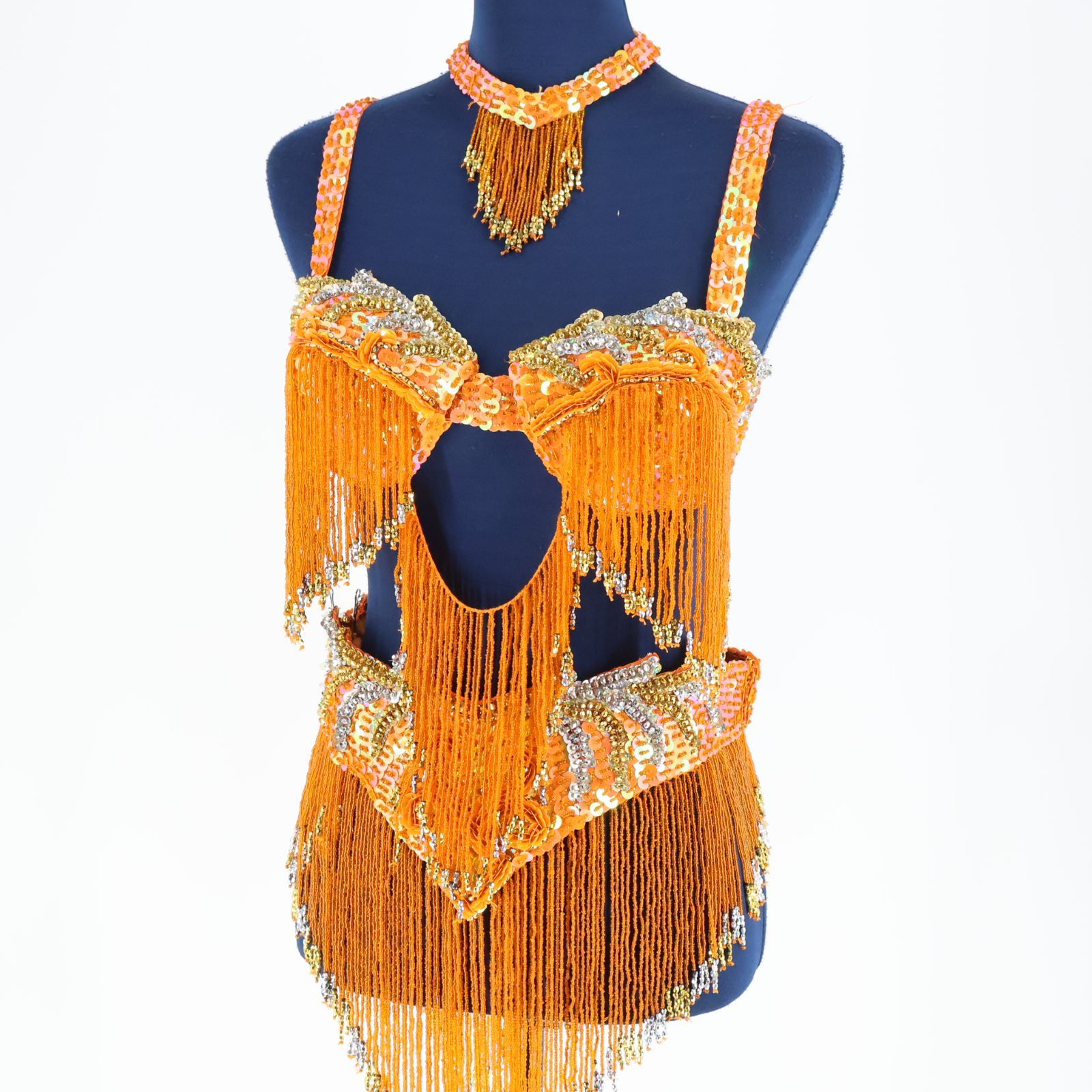ベリーダンス用 オリエンタル衣装 オレンジ スパンコールラメ×ビーズ 多数付き 豪華 重量感 輝き 煌びやか お洒落 鮮やか トップス ベルト セット ダンスウェア エスニック 小物 ダンス レディース アラビア アフリカン