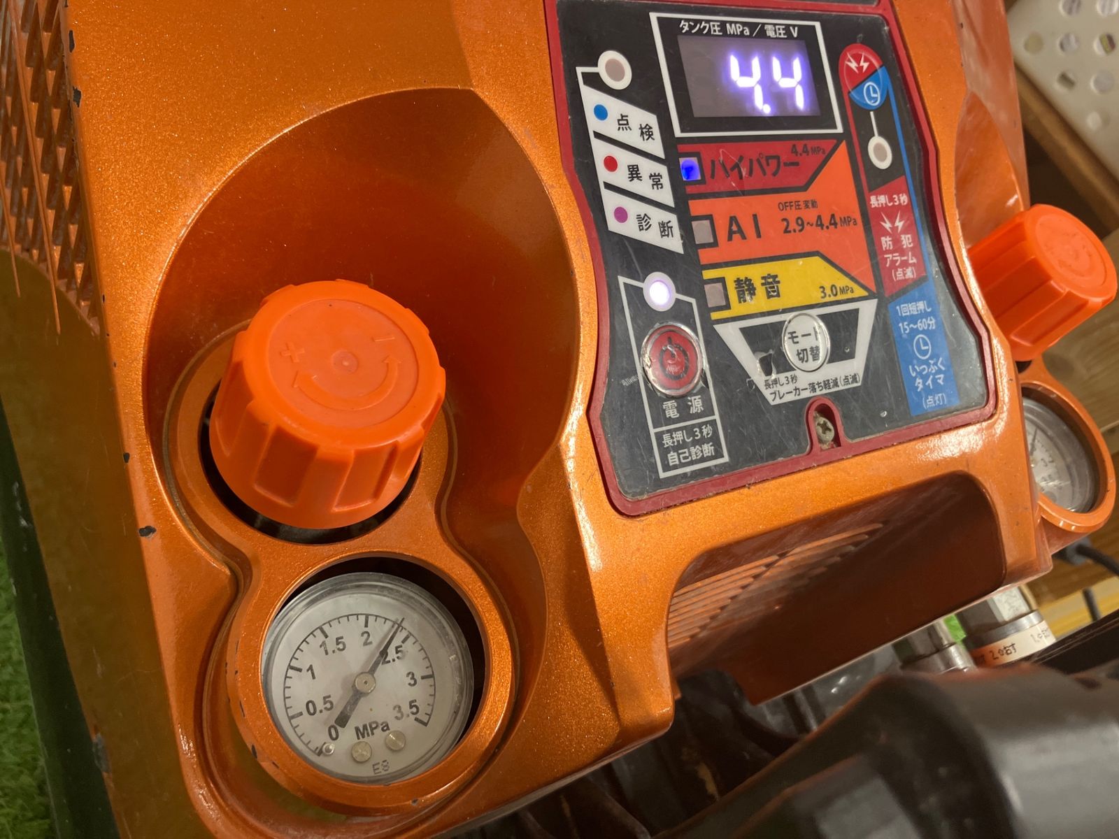 エアの圧力は4.4迄上がります。圧力調整メーターも2.3〜4MPaまで調節可能です。高圧の釘打ち機は普通に打てます。エアの再起動もします。