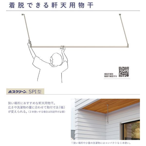 室内干しや乾燥機だけで洗濯物を乾かす方がメインの方でも、室内干しや乾燥機では乾きづらい洗濯物など「屋外で洗濯物を干したい場面」がときどき出てくることがあります。普段は室内干し、ときどき屋外干し。そんな生活スタイルにちょうどういい着脱式の軒天用ホスクリーンになります。狭い場所におすすめです。広さや洗濯物の量に合わせて取付寸法(幅)が変えられます。狭い場所や少量の洗濯物にはコンパクトな1本使いです。厳しい品質管理のもと、国内で製造しているので安心してご使用できます。