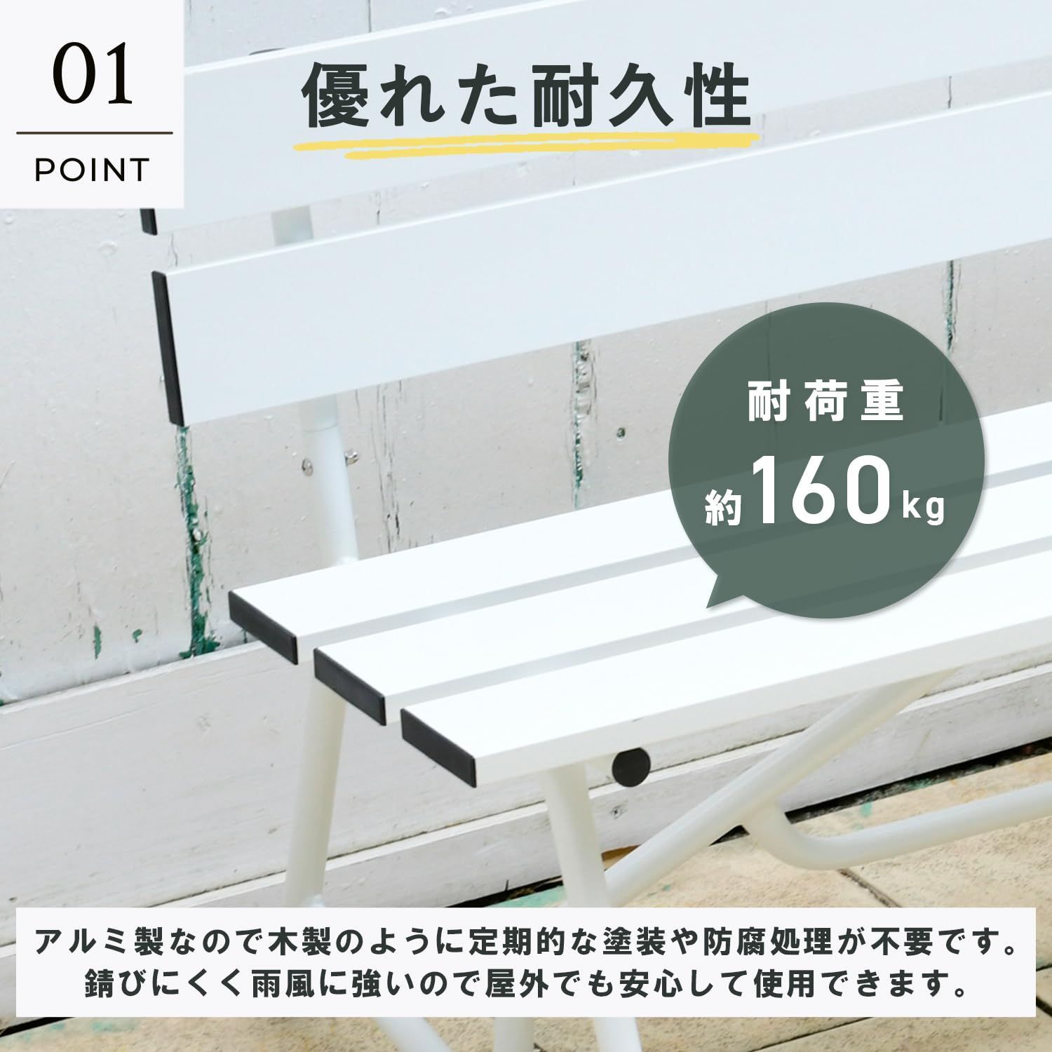 【優れた耐久性】アルミ製なので木製のように定期的な塗装や防腐処理が不要。錆びにくく雨風に強いので屋外でも使用できる。