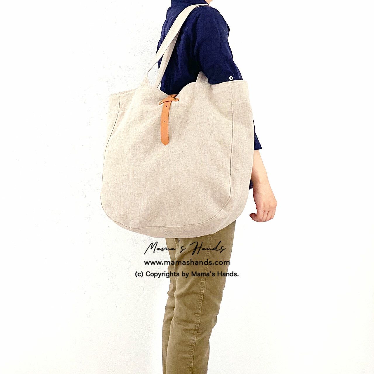 ⭐️厚めのリネン生地を使用。2枚仕立ての軽い大きめバックです。革とギボシが付いているので、バックに入れる物の大きさによって、3段階で留められます。