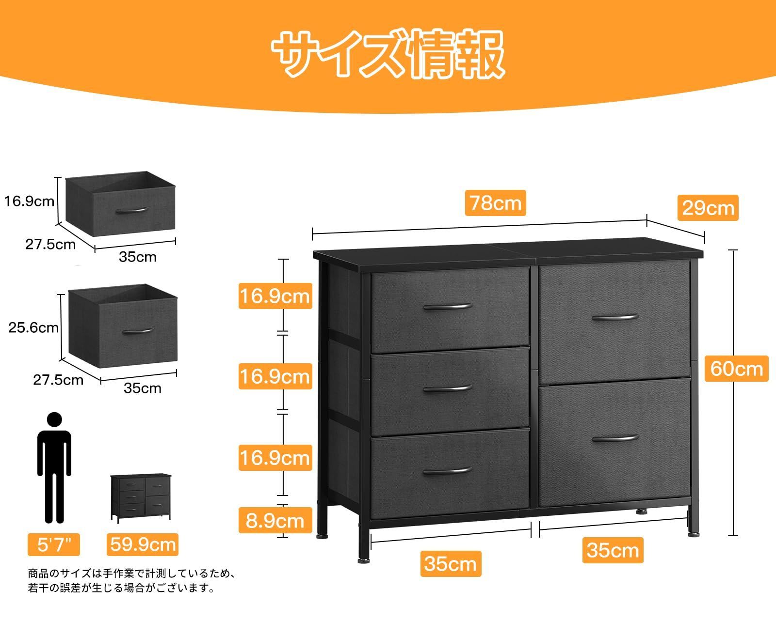 【さまざまな場所で活躍】このチェストは、寝室、クローゼット、リビングルーム、子供部屋、廊下、ベッドサイドに最適です。ランプ、花瓶などの装飾品を木製天板に置くことができます。