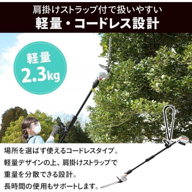 軽量&伸縮式ポールで、高所の剪定もラクラク!バッテリー式でコードがないので、どこでも楽に使えます。