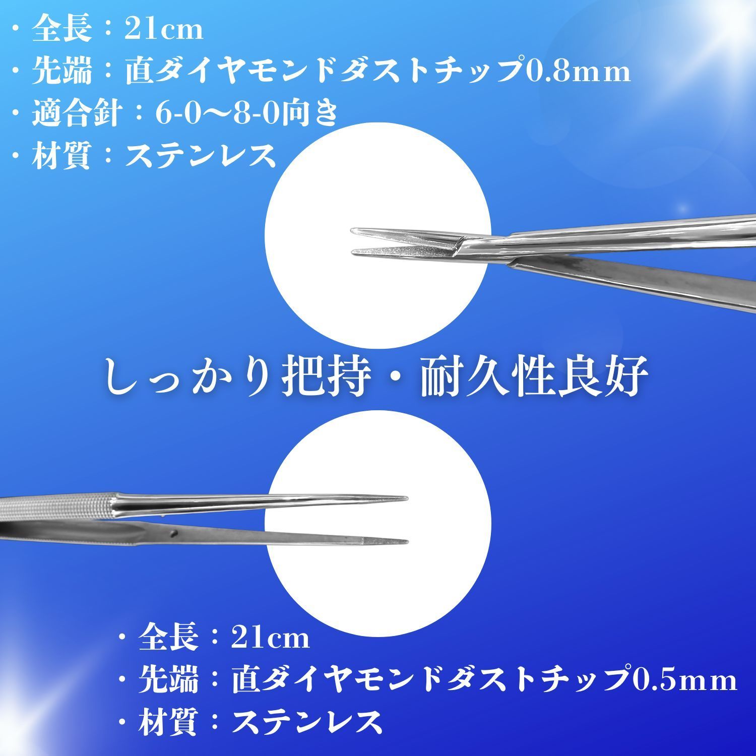 全長:21cm 先端:直ダイヤモンドダストチップ0.8mm 適合針:6-0 ~ 8-0向き