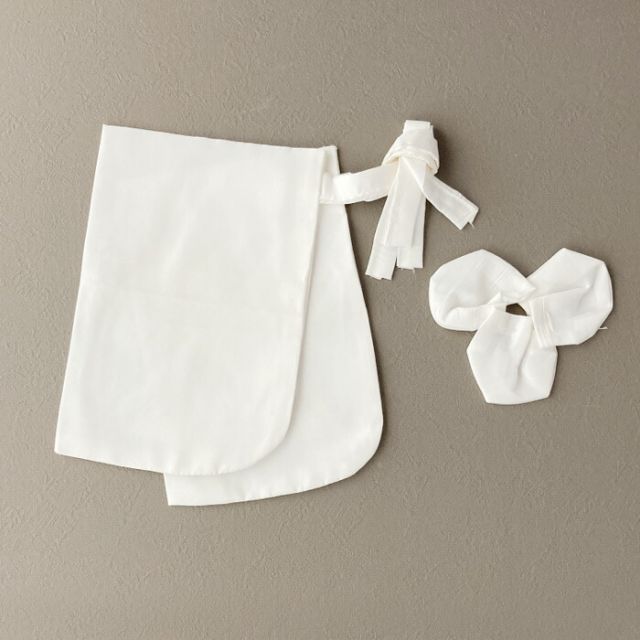 韓国にて仏式で死者を葬るとき死装束(しにしようぞく)経帷子(きょうかたびら)として着せる浄衣の事です。本来天然素材で仕立てる衣装で、こちらはインギョンと言う木材パルプが原料の天然素材を使ったセットです。弊社では小物までセットで販売しております。