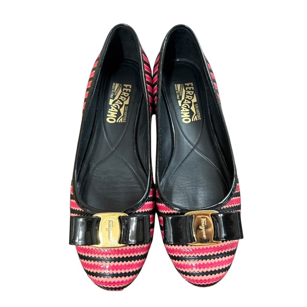 Salvatore Ferragamo サルヴァトーレフェラガモ ボーダー ヴァラリボン フラットパンプス サイズ8 1 2 約25.5 cm ピンク ブラック レディース 古着
