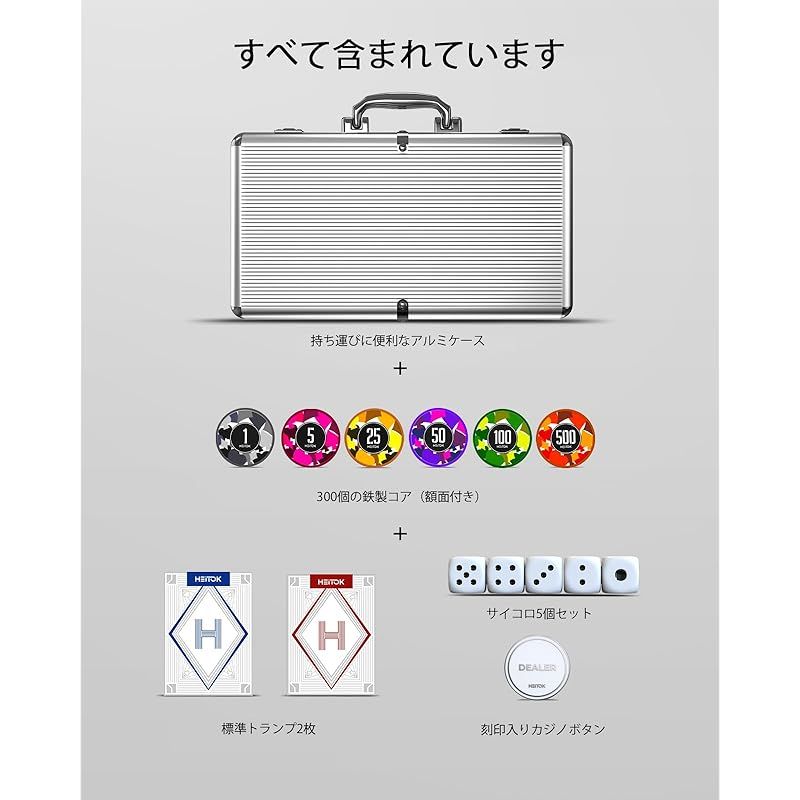 商品名:HEITOK ポーカーチップ ポーカーセット 300枚 数字入り 11.5g カジノチップ トランプ2組とサイコロ5個が付属 ABS製チップ アルミ製スーツケース入り