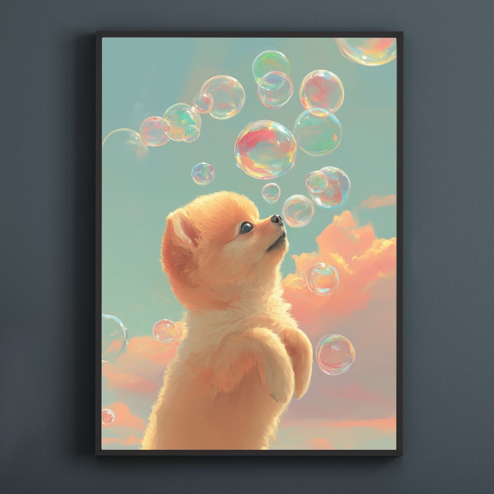 かわいいポメプー犬が、空に舞うシャボン玉を見つめる愛らしい瞬間を切り取ったアートポスターです。