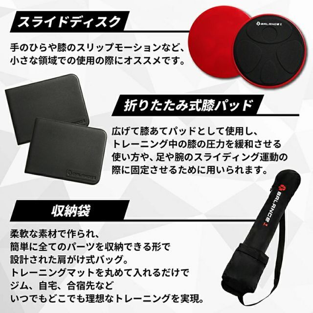 更にスライドディスク、折り畳み式膝パッドも付属しているので、多種多様なトレーニングが可能。