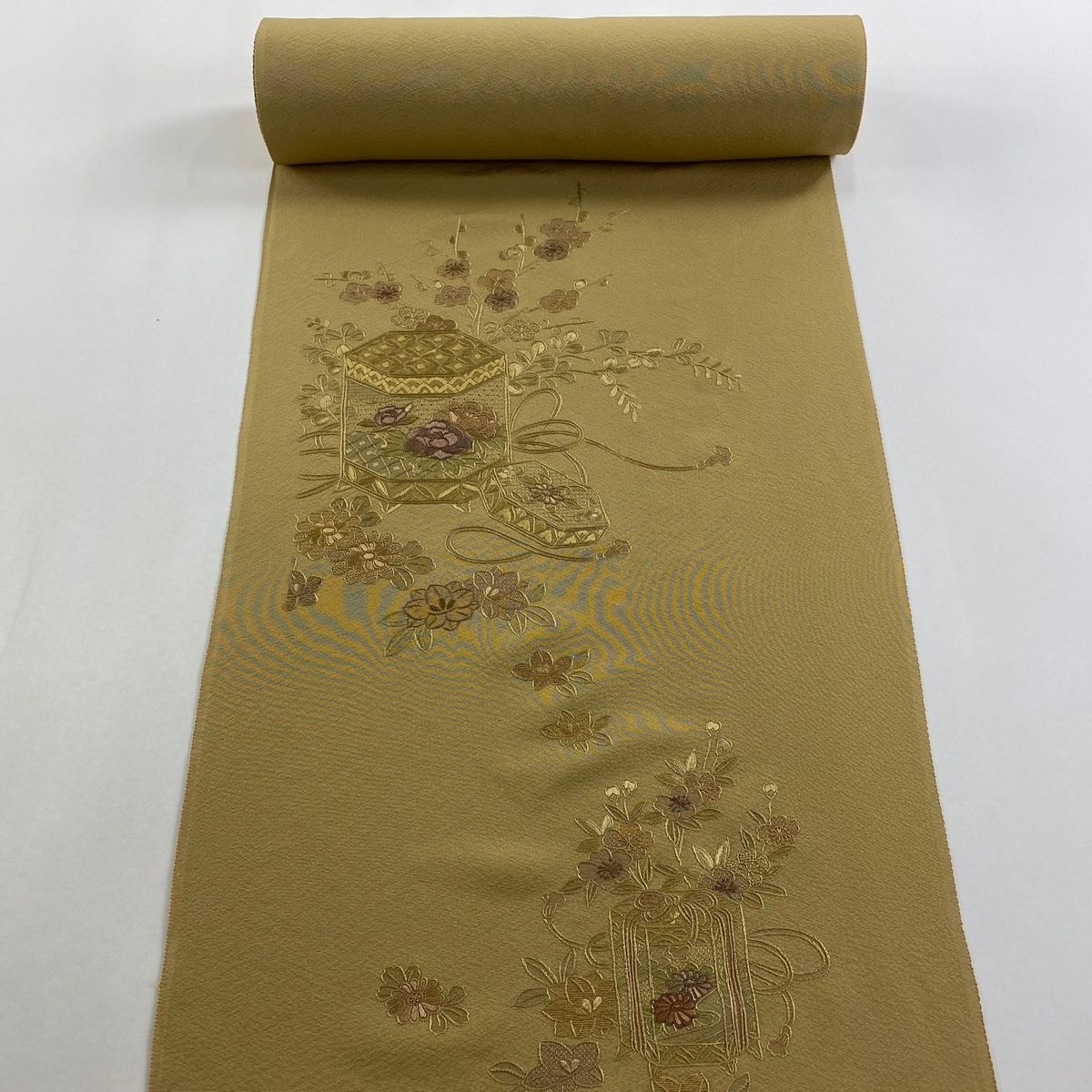 反物 付下げ 貝桶 草花 刺繍 金糸 薄黄土色 正絹