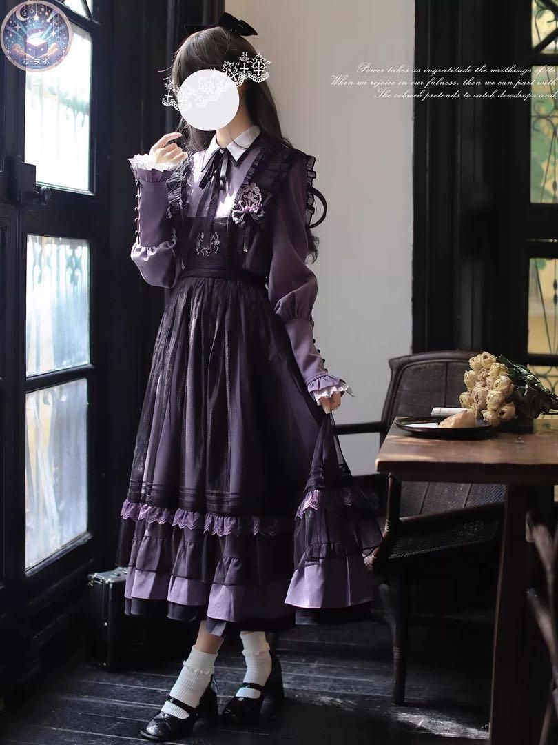 魔女学院 クラシカルロリィタ ロングワンピースセット エプロン 刺繍 パープル