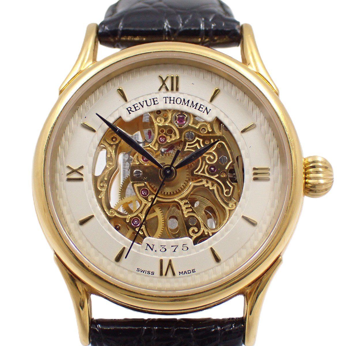 レビュートーメン スケルトン 手巻き メンズ 腕時計 ゴールドGP 革ベルト 4412006