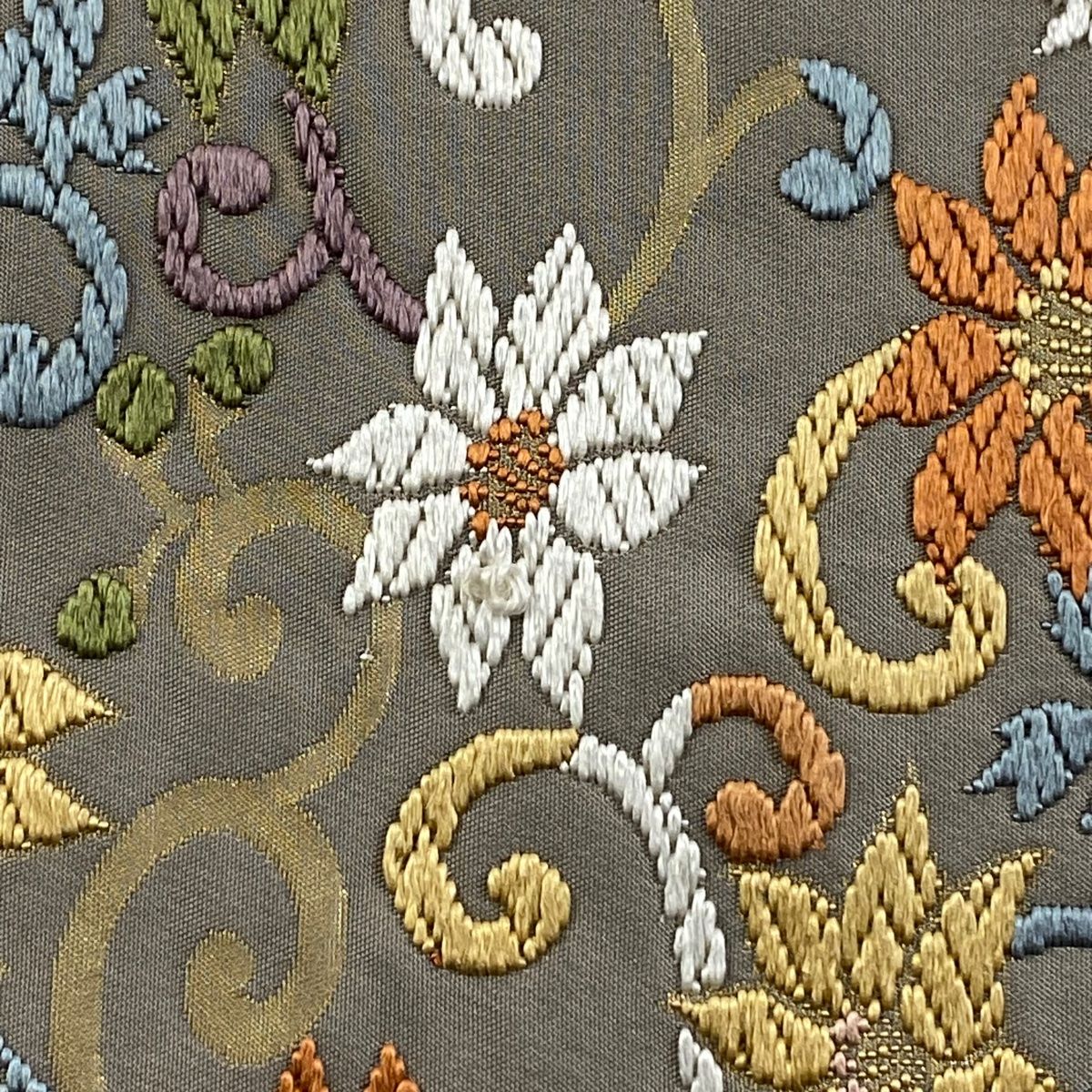 袋帯 秀品 服部織物 落款 花唐草 唐織 箔 灰色 六通 正絹