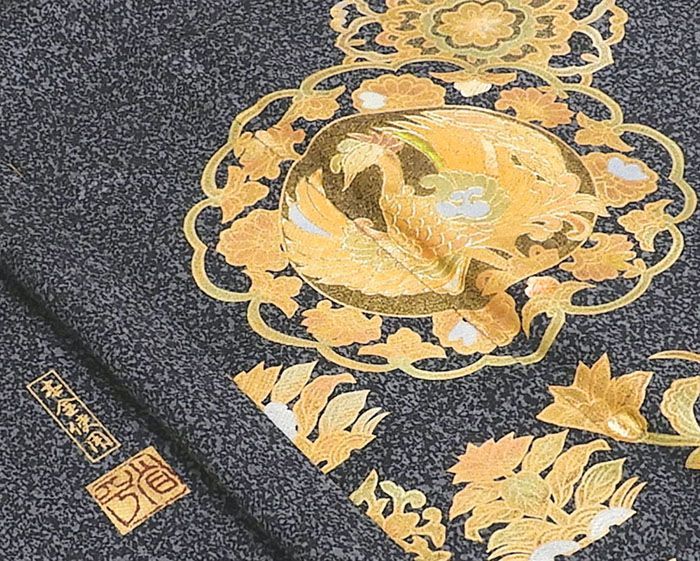 黒紺色やグレーのたたき総柄地に金銀彩箔で鳳凰唐花模様が柄付けされています。