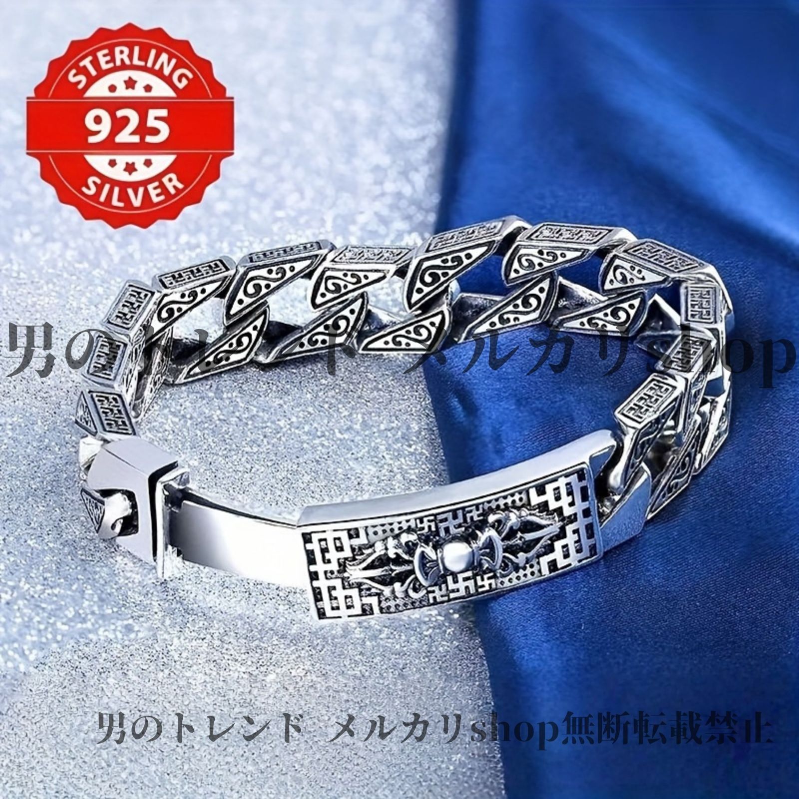 六字真言とヴァジュラのモチーフを刻んだ、S925スターリングシルバー製の重厚なメンズブレスレット。
