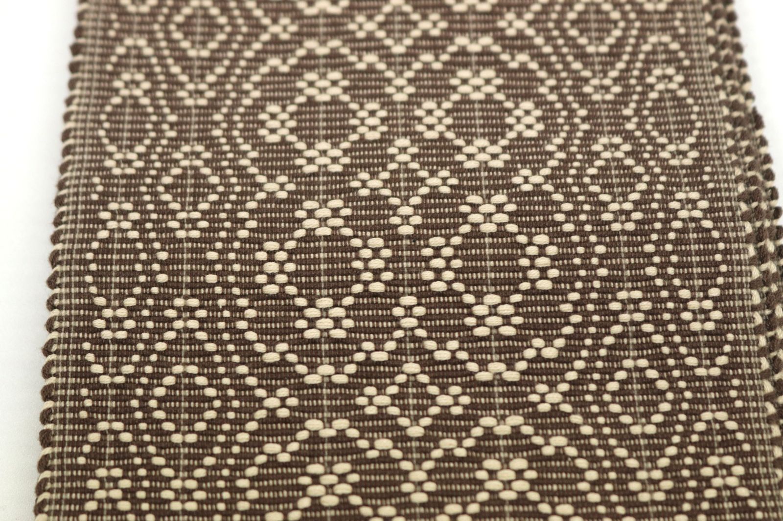 ややコシのある帯地は、焦げ茶色のお色目でございます。全体には、アイボリー色で花織の柄が規則正しく織り込まれており、お洒落でございます。
