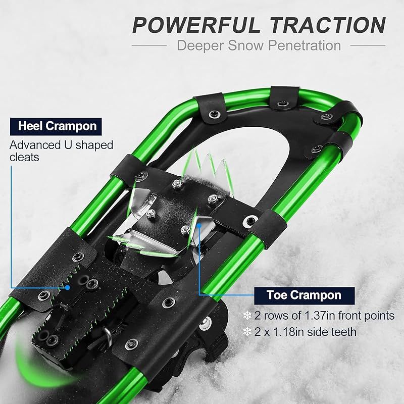 【男女兼用4-in-1セット】このセットには、2*スノーシューズ、1*トレッキングポール、1*スノーゲイター、および1*収納袋が含まれています。使いやすさをする軽量で高品質の素材で作られ、便利なバッグが付けているこのセットは、スノーシューイングの冒険やアウトドア活動に最適です。 80-120lbs / 35-55kgで21インチ、120-160lbs / 55-73kgで25インチ、160-250lbs / 73-113kgで30インチ。
