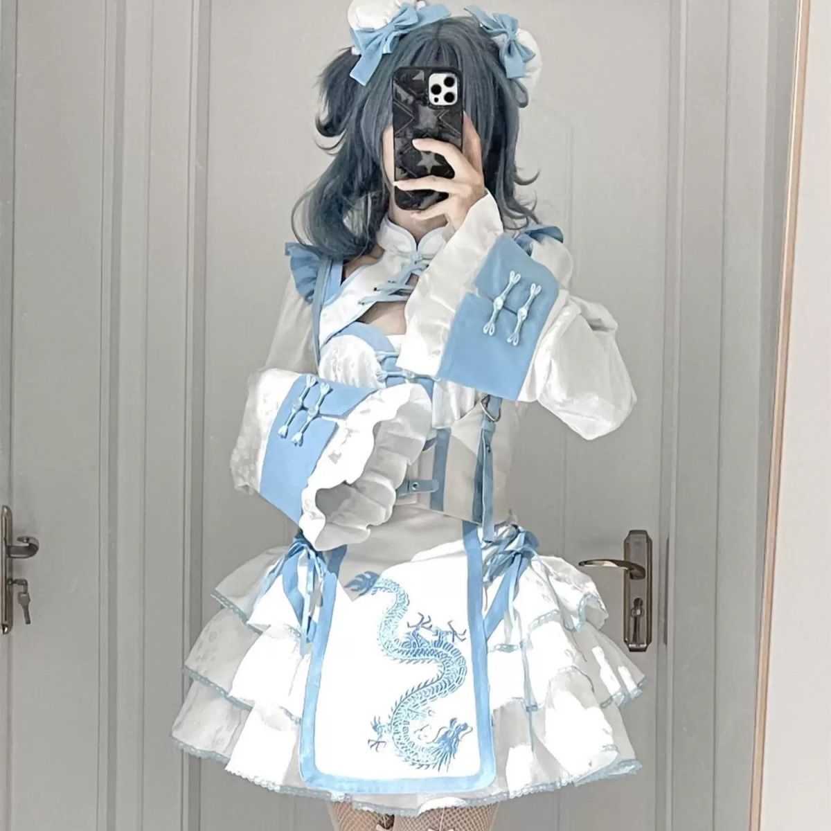 中華風 Lolita連衣裙 旗袍改良 スイート&スパイシー 中華娘風 豪華刺繍入り ドラゴンモチーフ 甘辛デザイン 長袖ワンピース ピンク ブラック スカート付き コスプレ衣装 特