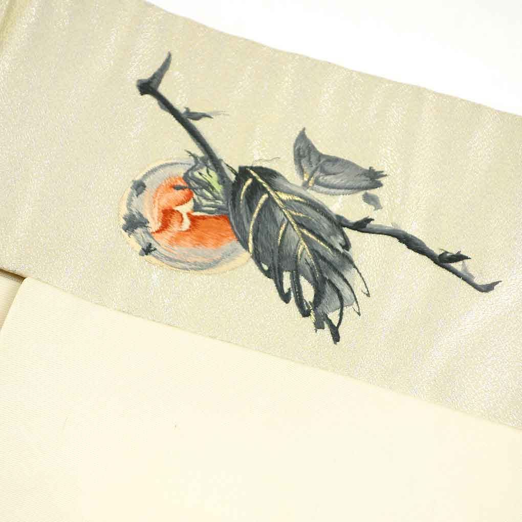 正絹の九寸名古屋帯です。生成色に銀糸を織り込んだ地色で柿の柄が刺繍されております。紬や小紋などカジュアル用途から付下や色無地などセミフォーマル用途まで合わせてお使いいただけます。