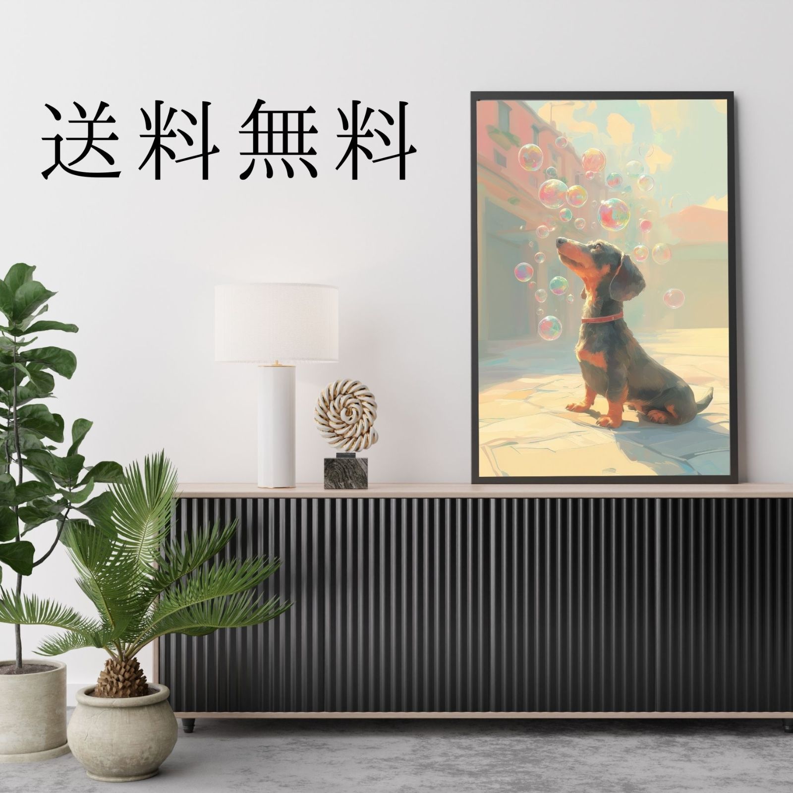 かわいいダックスフンド犬が、空に舞うシャボン玉を見つめる愛らしい瞬間を切り取ったアートポスターです。