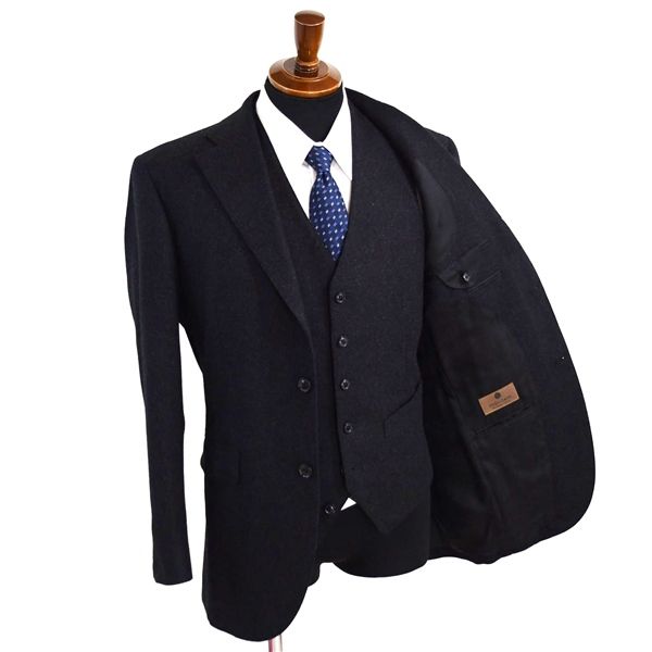 ・秋冬対応。オーストリア製 Leichtfried Loden生地使用。ベスト付き。段返り。3つボタンシングル。袖口4つ釦本切羽。総裏地仕上げ。サイドベンツ。フラップポケット。ネーム刺繍あり。