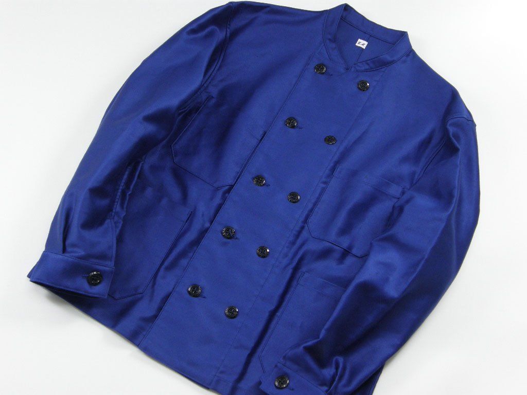 ETS.MATERIAUX マテリオ 超長綿 ピマーナ ダブル 立ち襟 ワークジャケット フレンチワーク カバーオールジャケット クロス型ボタン モールスキン 経年変化 ブルー | 秋冬