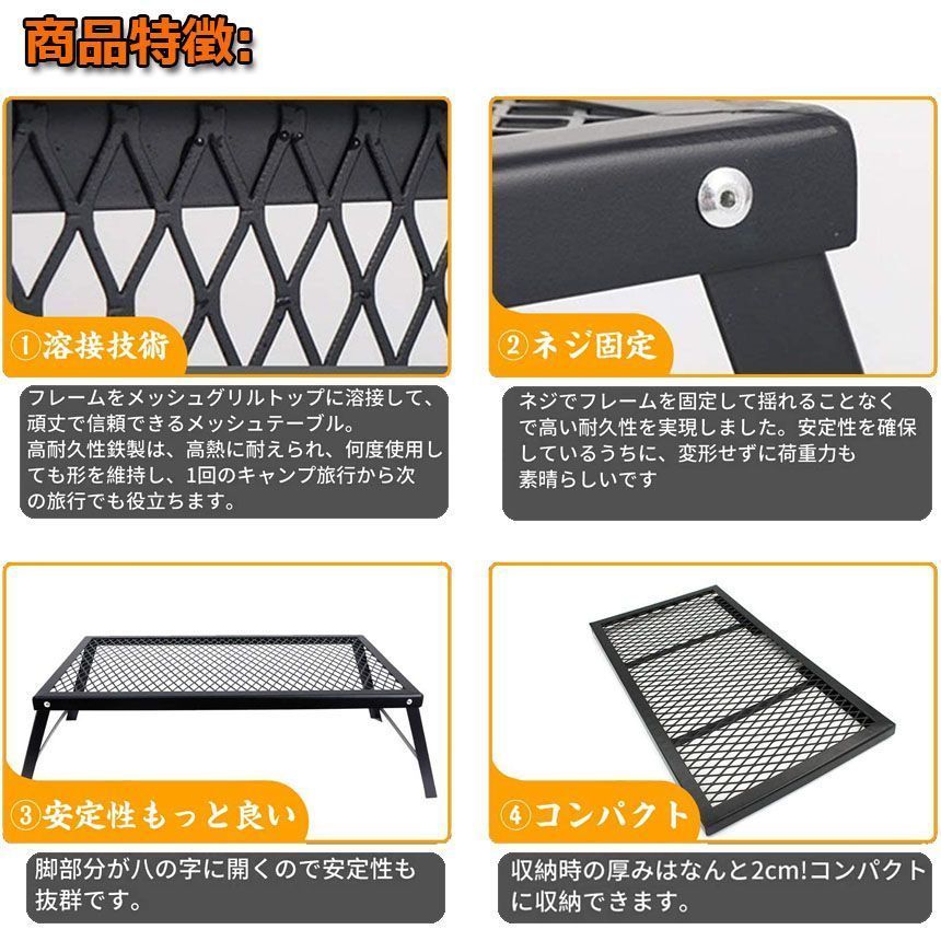 アウトドア用に鉄製のメッシュテーブルです。 使い方色々、バーナーとストーブの台として使用できるし、焚き火やバーベキューのゴトクとしても使用できます。 収納時の厚みは2cm。 コンパクトでスリムに保管できます。