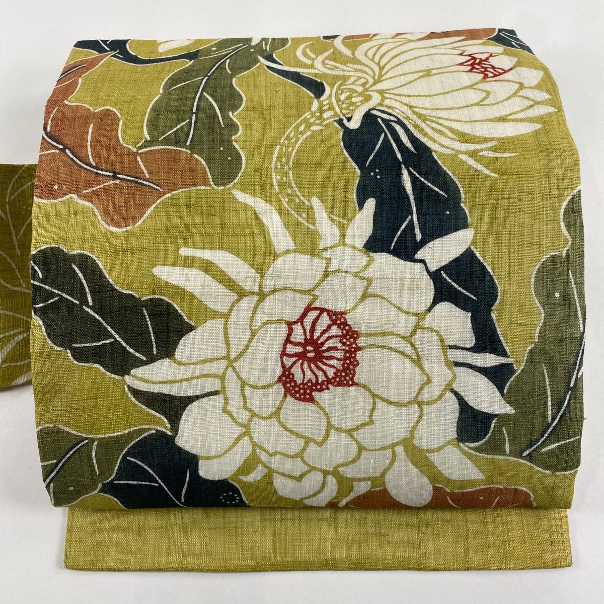 名古屋帯 栗山吉三郎 落款 草花 抹茶色 麻
