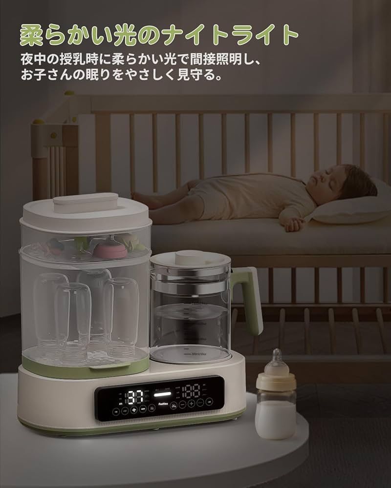 哺乳瓶をマックス24時間まで定時に消毒と乾燥してくれて、衛生的に保ちます。37~95 ℃の間で正確な温度調整でき、72時間まで保温機能付いています、適温に調整し、保温を使うことで、赤ちゃんの食事周りの負担を大幅に減らしてくれますよ。調乳ポット、ミルクウォーマー、哺乳瓶消毒器、哺乳瓶乾燥機、哺乳瓶保管ケース、電気ケトル、電気蒸し器といった7つを1台になる機能性の高い一品です。