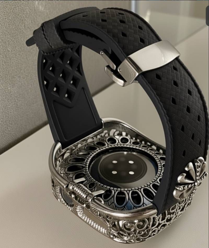 ブラック AppleWatch用フッ素ラバー バンド コンチョ アラベスクカバー ケース アップルウォッチ用 カスタムバンド 44 45 46 49 SE Ultra