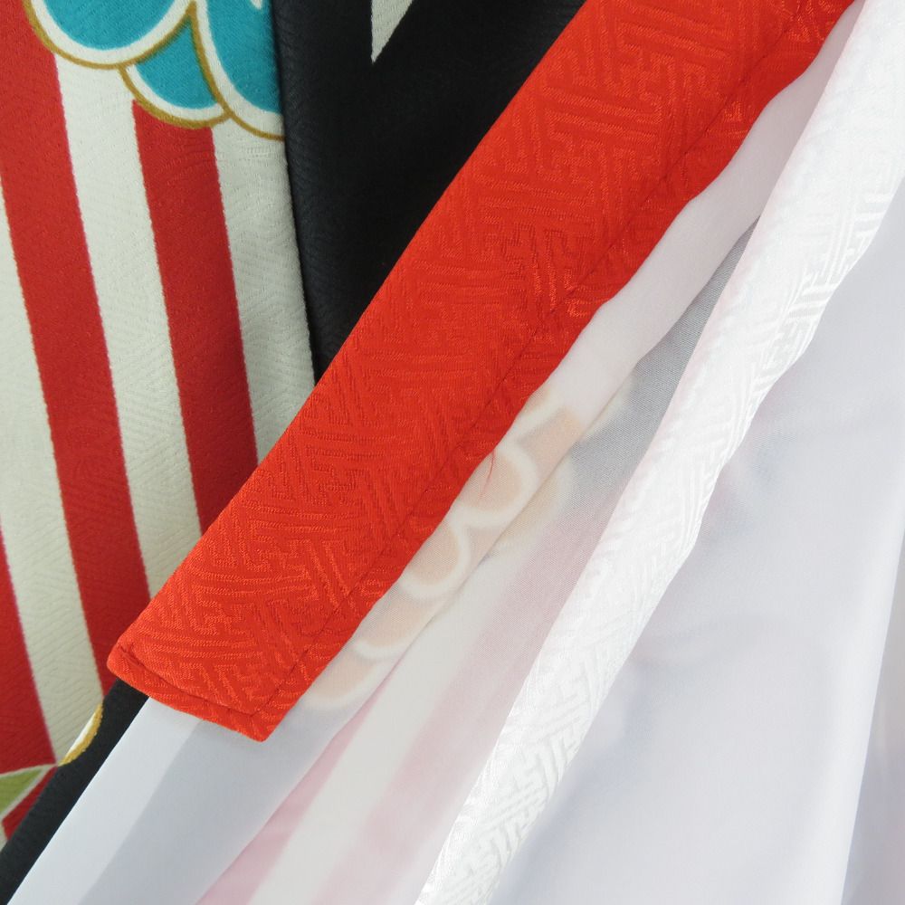 子供着物 女の子用 四つ身 襦袢セット ポリエステル 黒色x多色 矢羽根に花模様 洗える 子供きもの 女児 七五三 祝着 身丈134.5cm