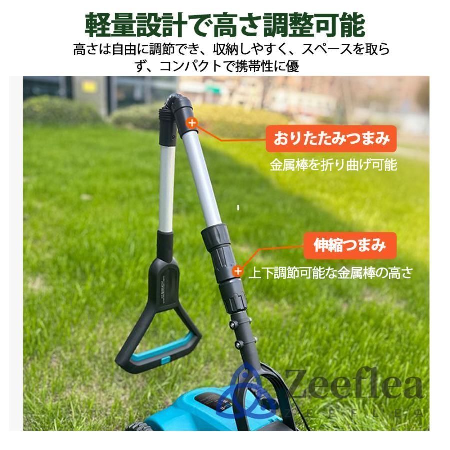 芝刈り機は、人間工学に基づいたデザインを採用しており、ハンドルの長さは身長や腕の長さに合わせて